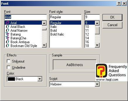 3) בתפריט שיפתח בוחרים גופן בעברית כמו אריאל (Arial), ובתיבה -script (סקריפט) למטה מצד ימין בוחרים Hebrew (עברית).